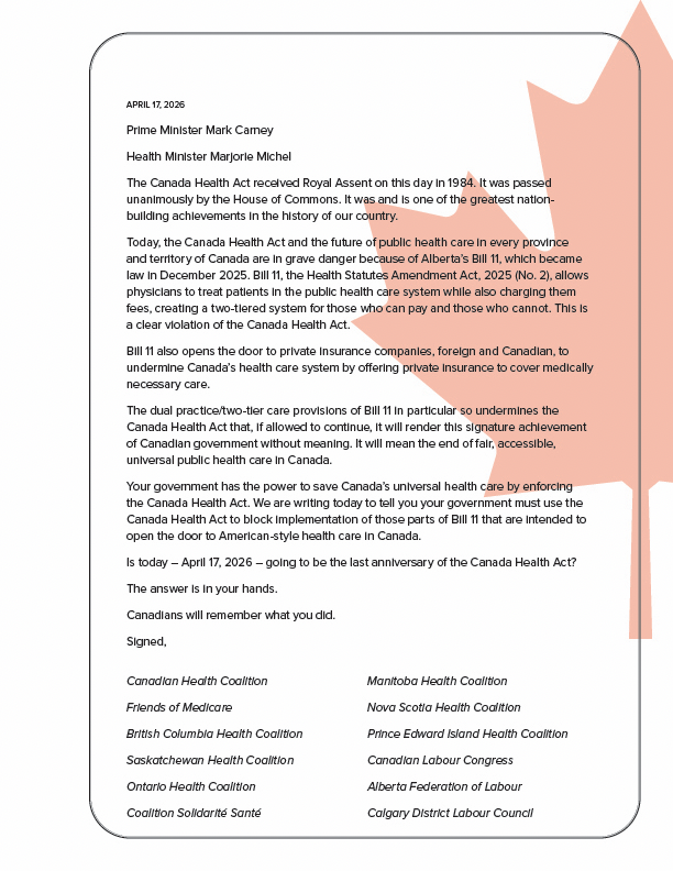 “The Canada Health Act and the future of public health care in every province and territory of Canada are in grave danger because of Alberta’s Bill 11, which became law in December 2025,” the letter sent today states. “Bill 11, the Health Statutes Amendment Act, 2025 (No. 2), allows physicians to treat patients in the public health care system while also charging them fees, creating a two-tiered system for those who can pay and those who cannot.”